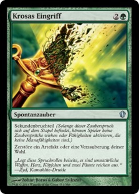 |  Variations— Parts— | Krosas EingriffSekundenbruchteil (Solange dieser Zauberspruch sich auf dem Stapel befindet, können Spieler keine Zaubersprüche wirken oder Fähigkeiten aktivieren, die keine Manafähigkeiten sind.) Zerstöre ein Artefakt oder eine Verzauberung deiner Wahl.