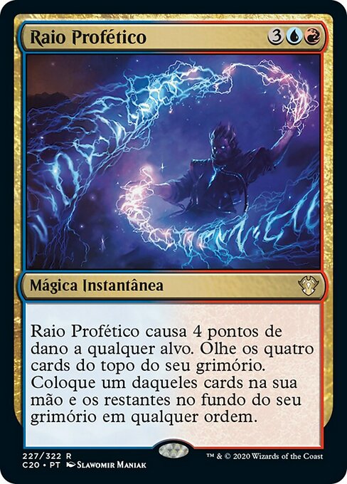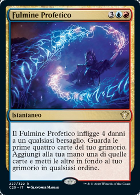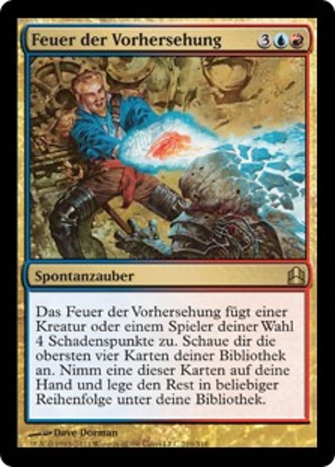 ![]() Variations— Parts— | Feuer der VorhersehungDas Feuer der Vorhersehung fügt einem Ziel deiner Wahl 4 Schadenspunkte zu. Schaue dir die obersten vier Karten deiner Bibliothek an. Nimm eine der Karten auf deine Hand und lege den Rest in beliebiger Reihenfolge unter deine Bibliothek.
