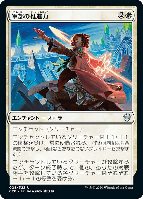 ![]() Variations— Parts— | Kriegerischer ImpulsVerzaubert eine Kreatur Die verzauberte Kreatur erhält +1/+1 und ist angestachelt. (Sie greift in jedem Kampf an, falls möglich, und greift einen anderen Spieler als dich an, falls möglich.) Immer wenn die verzauberte Kreatur angreift, erhält jede andere Kreatur, die einen deiner Gegner angreift, +1/+1 bis zum Ende des Zuges.