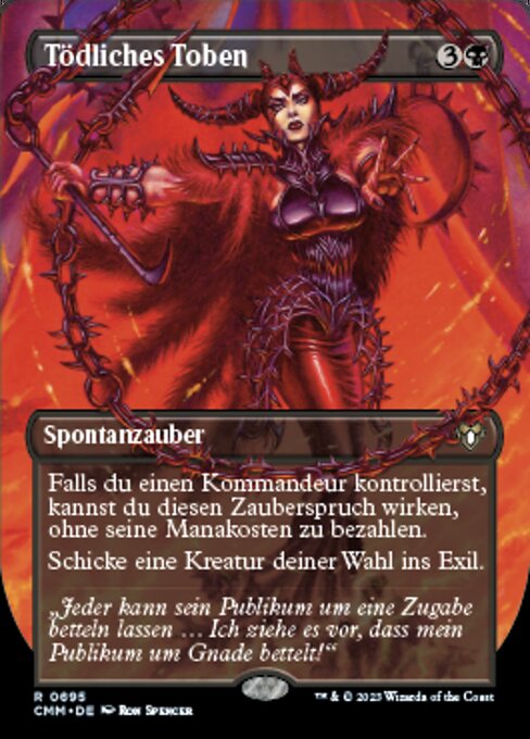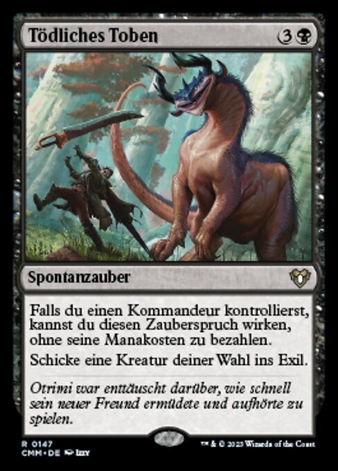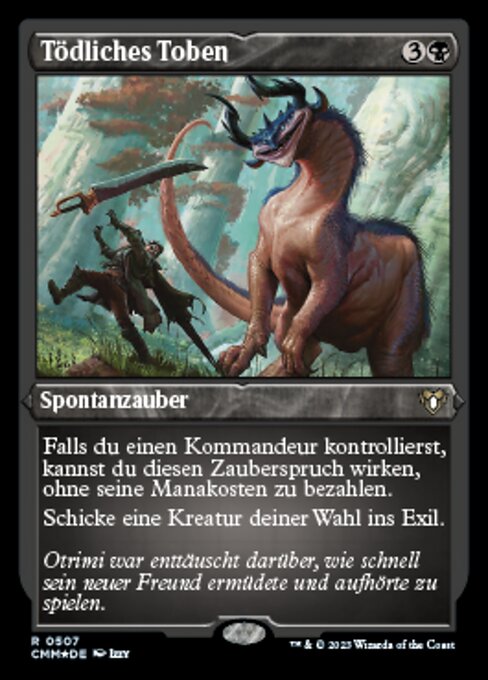 ![]() Variations— Parts— | Tödliches TobenFalls du einen Kommandeur kontrollierst, kannst du diesen Zauberspruch wirken, ohne seine Manakosten zu bezahlen. Schicke eine Kreatur deiner Wahl ins Exil.
