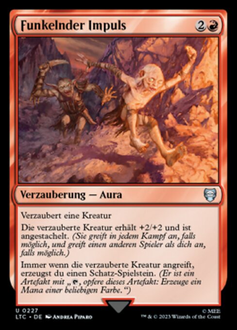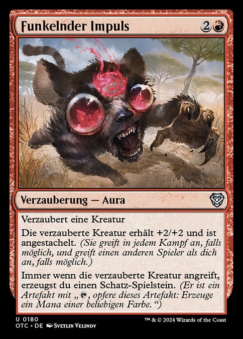 |  Variations— Parts— | Funkelnder ImpulsVerzaubert eine Kreatur Die verzauberte Kreatur erhält +2/+2 und ist angestachelt. (Sie greift in jedem Kampf an, falls möglich, und greift einen anderen Spieler als dich an, falls möglich.) Immer wenn die verzauberte Kreatur angreift, erzeugst du einen Schatz-Spielstein. (Er ist ein Artefakt mit „