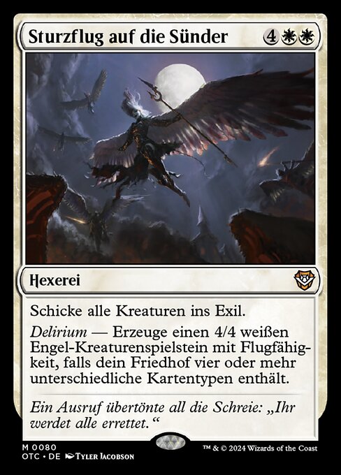 ![]() Variations— Parts— | Sturzflug auf die SünderSchicke alle Kreaturen ins Exil. Delirium — Erzeuge einen 4/4 weißen Engel-Kreaturenspielstein mit Flugfähigkeit, falls dein Friedhof vier oder mehr unterschiedliche Kartentypen enthält.