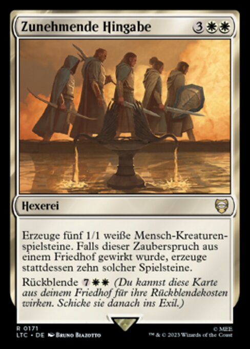 |  Variations— Parts— | Zunehmende HingabeErzeuge fünf 1/1 weiße Mensch-Kreaturenspielsteine. Falls dieser Zauberspruch aus einem Friedhof gewirkt wurde, erzeuge stattdessen zehn solcher Spielsteine. Rückblende