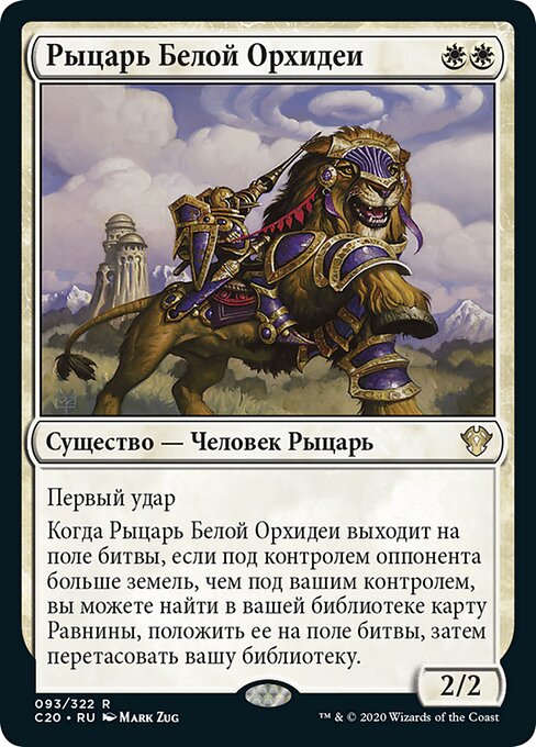 |  Variations— Parts— | Ritter der weißen Orchidee2 / 2 Erstschlag Wenn der Ritter der weißen Orchidee ins Spiel kommt und falls ein Gegner mehr Länder kontrolliert als du, kannst du deine Bibliothek nach einer Ebene-Karte durchsuchen, sie ins Spiel bringen und dann deine Bibliothek mischen.