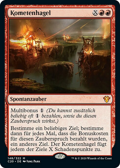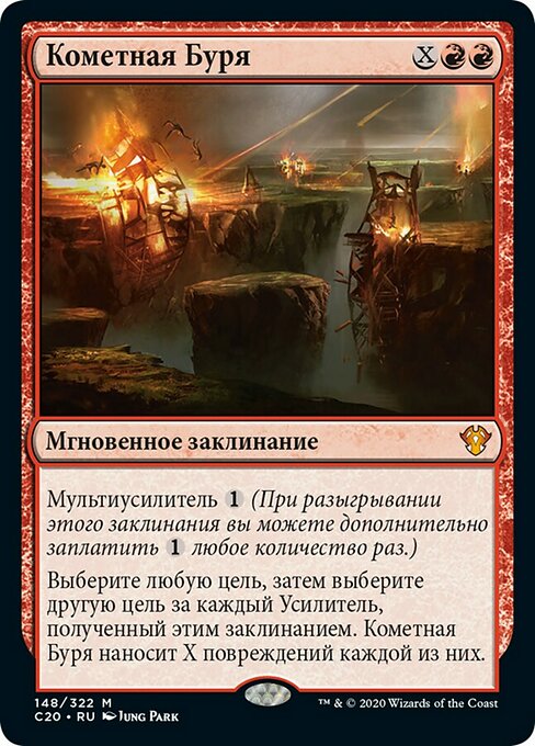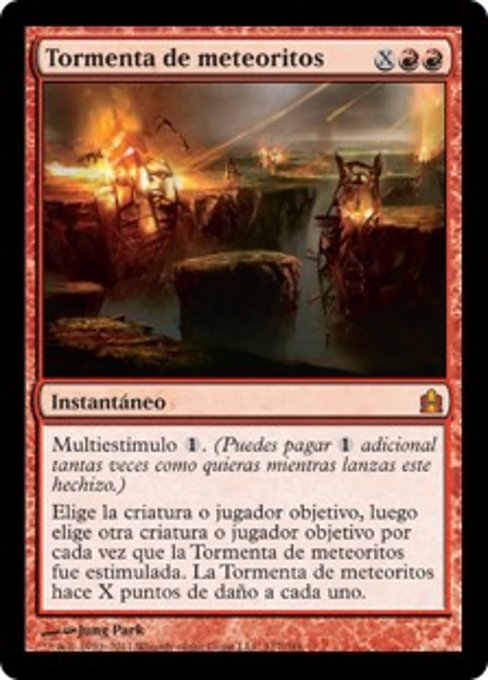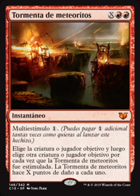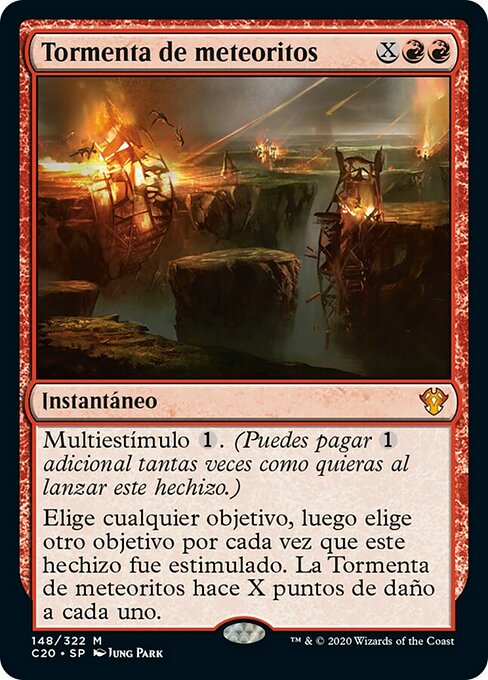 ![]() Variations— Parts— | Tormenta de meteoritosMultiestímulo Elige cualquier objetivo, luego elige otro objetivo por cada vez que este hechizo fue estimulado. La Tormenta de meteoritos hace X puntos de daño a cada uno.
