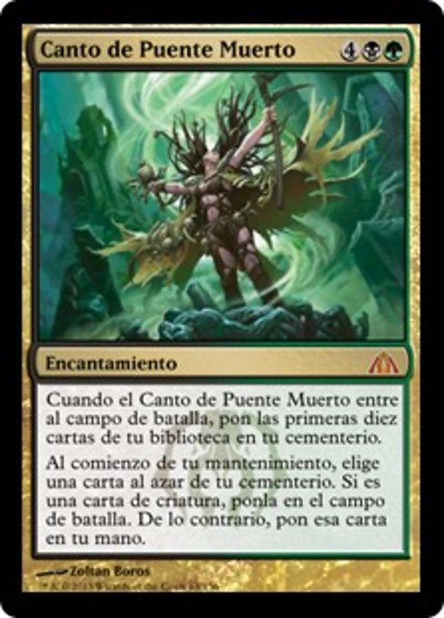 |  Variations— Parts— | Canto de Puente MuertoCuando el Canto de Puente Muerto entre al campo de batalla, pon las diez primeras cartas de tu biblioteca en tu cementerio. Al comienzo de tu mantenimiento, elige una carta al azar de tu cementerio. Si es una carta de criatura, ponla en el campo de batalla. De lo contrario, pon esa carta en tu mano.