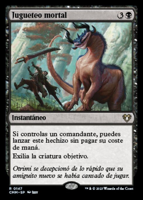 ![]() Variations— Parts— | Jugueteo mortalSi controlas un comandante, puedes lanzar este hechizo sin pagar su coste de maná. Exilia la criatura objetivo.