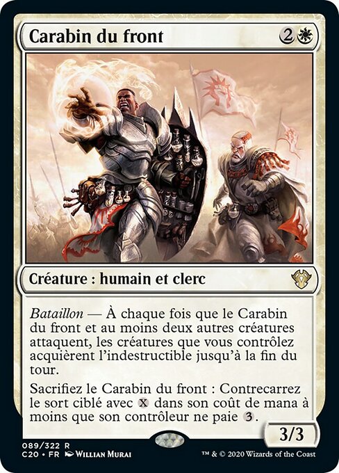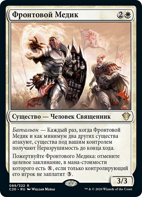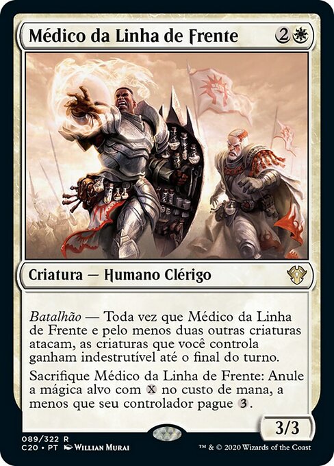 |  Variations— Parts— | Medico in Prima Linea3 / 3 Battaglione — Ogniqualvolta il Medico in Prima Linea e almeno altre due creature attaccano, le creature che controlli hanno indistruttibile fino alla fine del turno. Sacrifica il Medico in Prima Linea: Neutralizza una magia bersaglio con