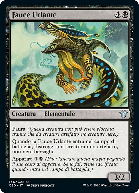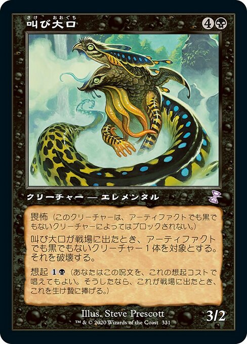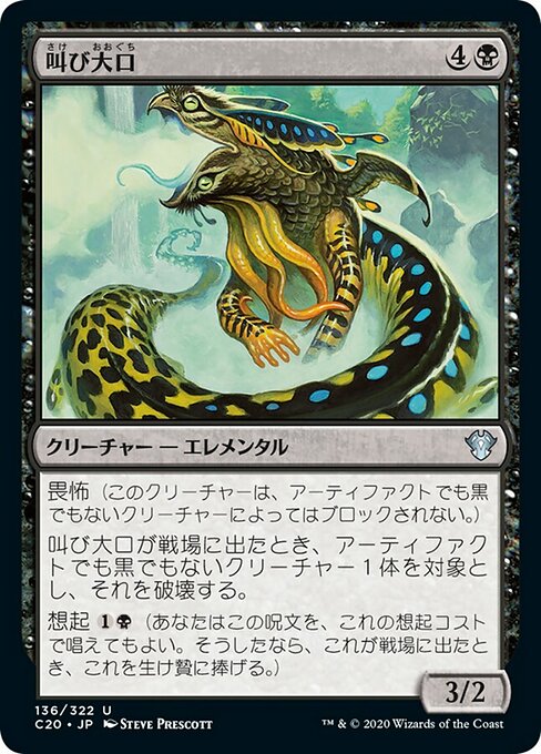 |  Variations— Parts— | 叫び大口3 / 2 畏怖(このクリーチャーは、アーティファクトでも黒でもないクリーチャーによってはブロックされない。) 叫び大口が戦場に出たとき、アーティファクトでも黒でもないクリーチャー1体を対象とし、それを破壊する。 想起