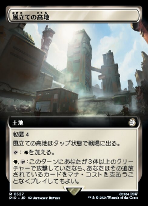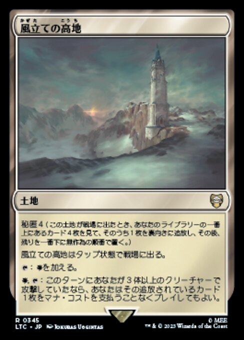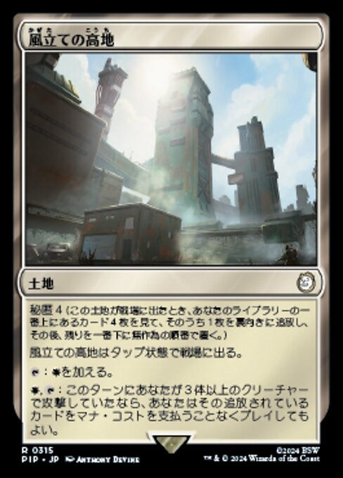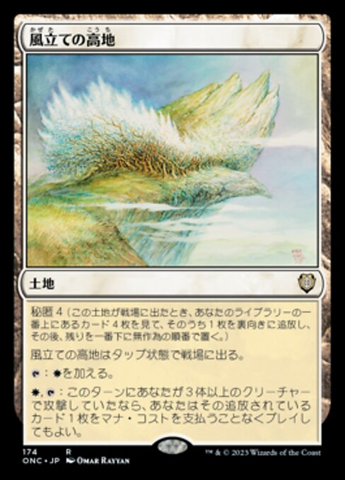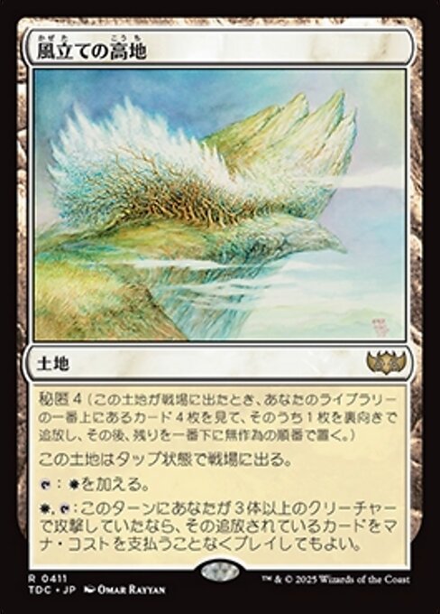 ![]() Variations— Parts— | 風立ての高地秘匿(この土地はタップ状態で戦場に出る。そうしたとき、あなたのライブラリーの一番上からカードを4枚見て、そのうち1枚を裏向きに追放し、その後残りをあなたのライブラリーの一番下に置く。)