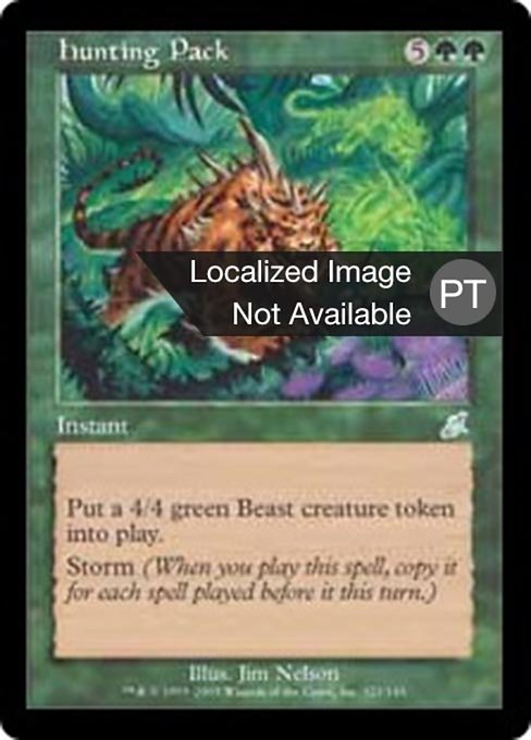 |  Variations— Parts— | Matilha de CaçaCrie uma ficha de criatura verde 4/4 do tipo Besta. Rajada (Quando você conjurar esta mágica, faça uma cópia dela para cada mágica conjurada antes dela neste turno.)