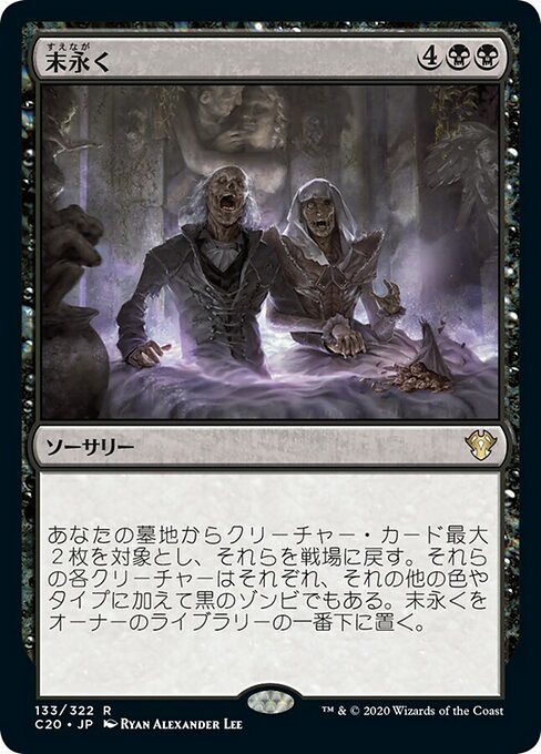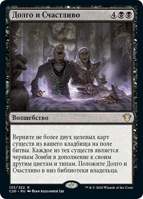 |  Variations— Parts— | Долго и СчастливоВерните не более двух целевых карт существ из вашего кладбища на поле битвы. Каждое из тех существ является черным Зомби в дополнение к своим другим цветам и типам. Положите Долго и Счастливо в низ библиотеки владельца.