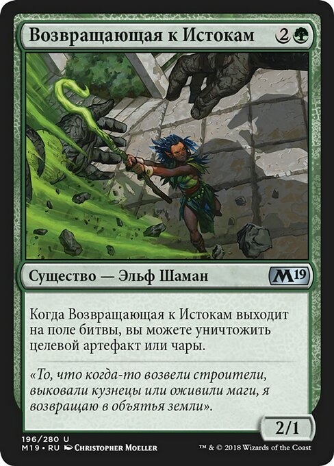 ![]() Variations— Parts— | Возвращающая к Истокам2 / 1 Когда Возвращающая к Истокам выходит на поле битвы, вы можете уничтожить целевой артефакт или чары.