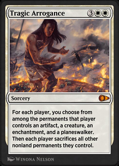 |  Variations— Parts— | Tragic ArroganceFor each player, you choose from among the permanents that player controls an artifact, a creature, an enchantment, and a planeswalker. Then each player sacrifices all other nonland permanents they control.