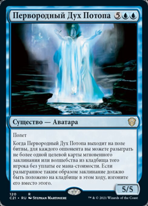 ![]() Variations— Parts— | Diluvian Primordial5 / 5 Flying When this creature enters, for each opponent, you may cast up to one target instant or sorcery card from that player's graveyard without paying its mana cost. If a spell cast this way would be put into a graveyard, exile it instead.
