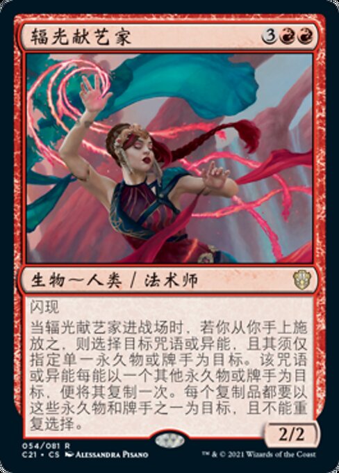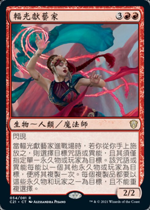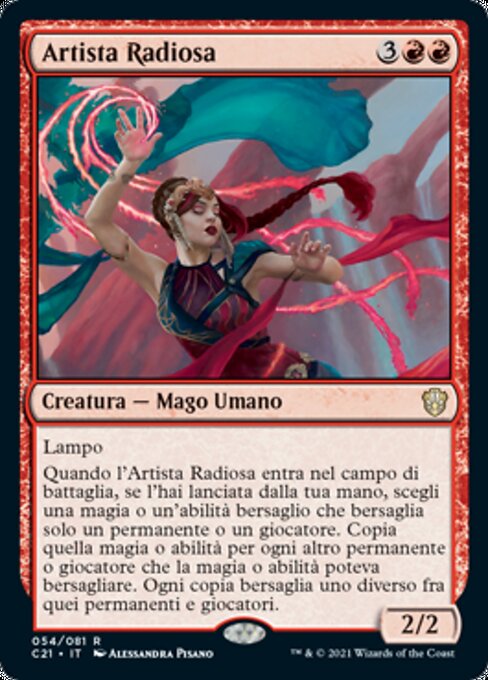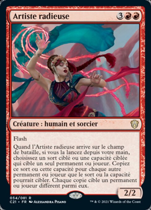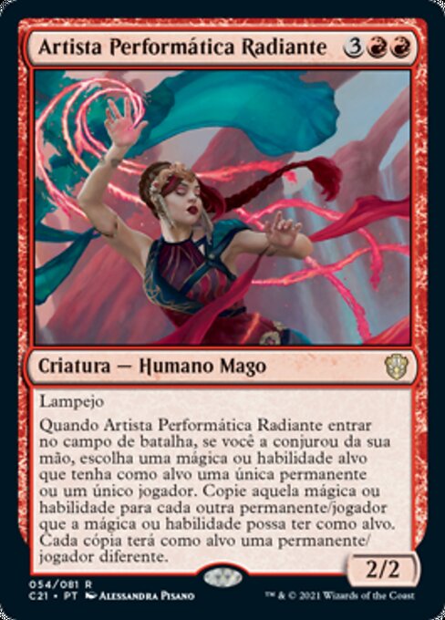 |  Variations : 1Parts : 2 | Radiant Performer2 / 2 Flash When this creature enters, if you cast it from your hand, choose target spell or ability that targets only a single permanent or player. Copy that spell or ability for each other permanent or player the spell or ability could target. Each copy targets a different one of those permanents and players.