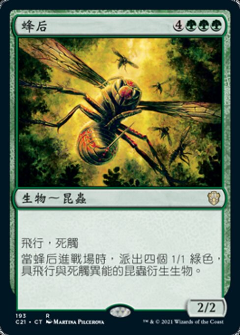 |  Variations— Parts— | Avispa reina2 / 2 Vuela, toque mortal. Cuando la Avispa reina entre al campo de batalla, crea cuatro fichas de criatura Insecto verdes 1/1 con las habilidades de volar y toque mortal.