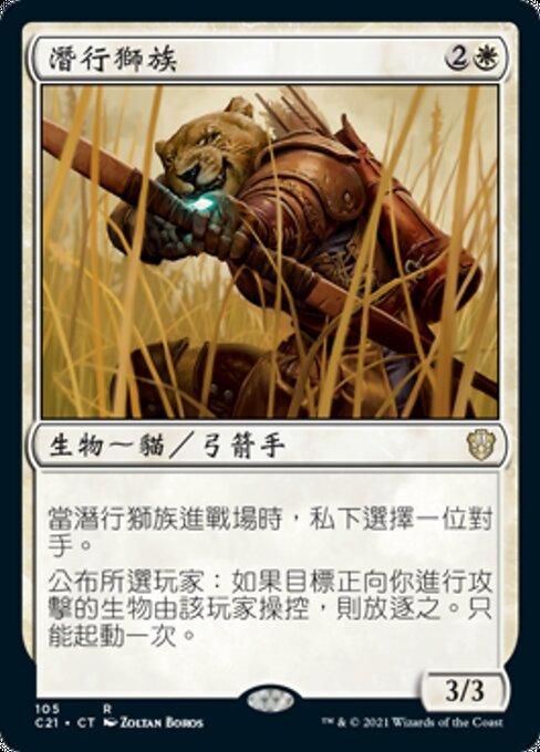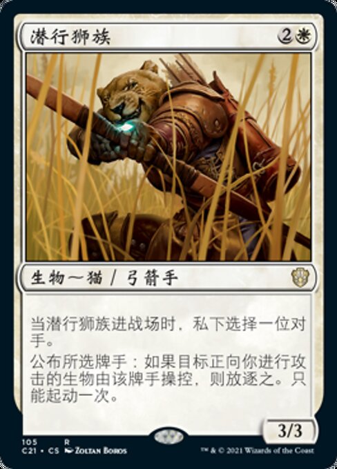 ![]() Variations— Parts— | Léonine en chasse3 / 3 Quand la Léonine en chasse arrive sur le champ de bataille, choisissez secrètement un adversaire. Révélez le joueur choisi : Exilez une créature ciblée qui vous attaque si elle est contrôlée par le joueur choisi. N'activez qu'une seule fois.