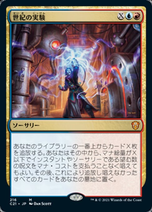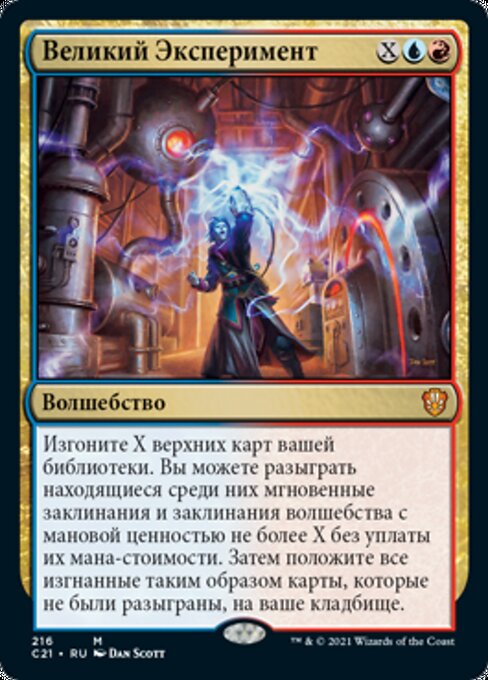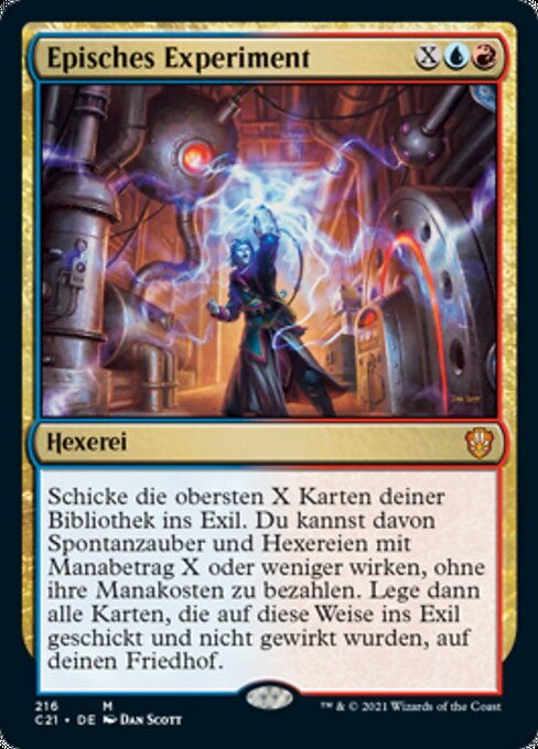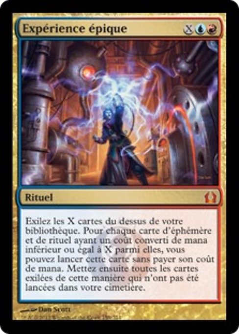 ![]() Variations— Parts— | Expérience épiqueExilez les X cartes du dessus de votre bibliothèque. Vous pouvez lancer les sorts d'éphémère et de rituel avec une valeur de mana inférieure ou égale à X parmi elles sans payer leur coût de mana. Mettez ensuite toutes les cartes exilées de cette manière qui n'ont pas été lancées dans votre cimetière.