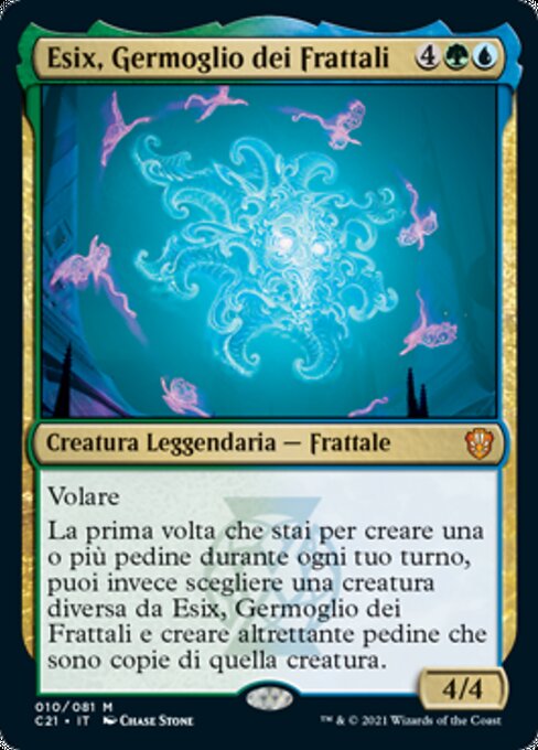 ![]() Variations : 1Parts— | Esix, Germoglio dei Frattali4 / 4 Volare La prima volta che stai per creare una o più pedine durante ogni tuo turno, puoi invece scegliere una creatura diversa da Esix, Germoglio dei Frattali e creare altrettante pedine che sono copie di quella creatura.