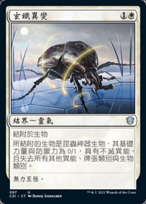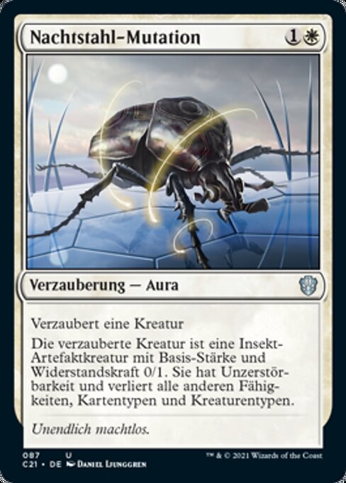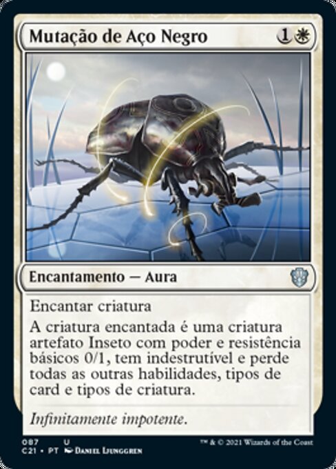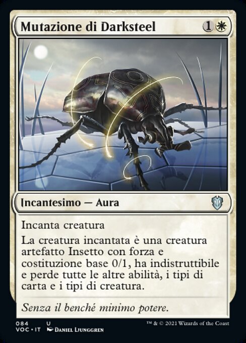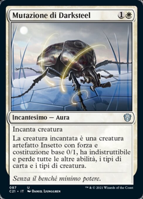|  Variations— Parts— | Mutazione di DarksteelIncanta creatura La creatura incantata è una creatura artefatto Insetto con forza e costituzione base 0/1, ha indistruttibile e perde tutte le altre abilità, i tipi di carta e i tipi di creatura.