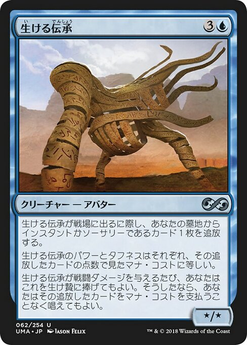 |  Variations— Parts— | 生ける伝承* / * 生ける伝承が戦場に出るに際し、あなたの墓地からインスタントかソーサリーであるカード1枚を追放する。 生ける伝承のパワーとタフネスはそれぞれ、その追放したカードのマナ総量に等しい。 生ける伝承が戦闘ダメージを与えるたび、あなたは「これを生け贄に捧げ、その追放したカードをマナ・コストを支払うことなく唱えてもよい。」を選んでもよい。