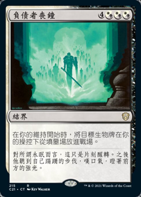 ![]() Variations— Parts— | 債務者の弔鐘あなたのアップキープの開始時に、墓地からクリーチャー・カード1枚を対象とする。それをあなたのコントロール下で戦場に出す。