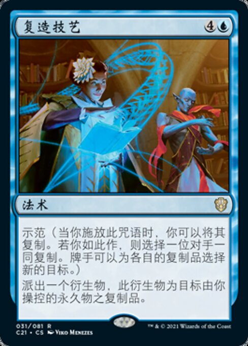 ![]() Variations : 1Parts— | 複製の技実演(あなたがこの呪文を唱えたとき、あなたは「これをコピーし、対戦相手1人にもこれをコピーさせる。両プレイヤーは自分のコピーの新しい対象を選んでもよい。」を選んでもよい。) あなたがコントロールしているパーマネント1つを対象とする。それのコピーであるトークン1つを生成する。