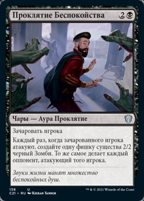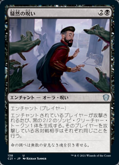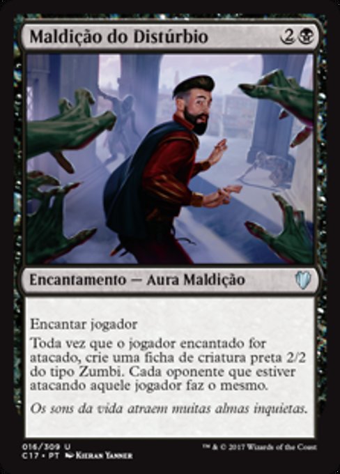 ![]() Variations— Parts— | Maldição do DistúrbioEncantar jogador Toda vez que o jogador encantado for atacado, crie uma ficha de criatura Zumbi preta 2/2. Cada oponente que estiver atacando aquele jogador faz o mesmo.