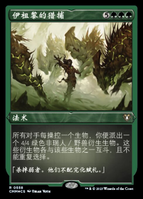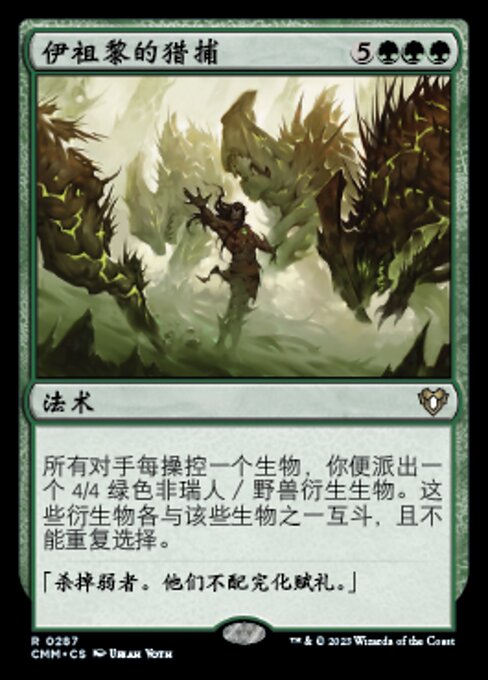 ![]() Variations— Parts— | 伊祖黎的猎捕所有对手每操控一个生物,你便派出一个4/4绿色野兽衍生生物。这些野兽各与该些生物之一互斗,且不能重复选择。