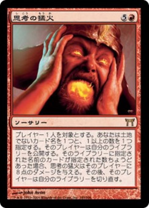 |  Variations— Parts— | MindblazeChoose a nonland card name and a number greater than 0. Target player reveals their library. If that library contains exactly the chosen number of cards with the chosen name, Mindblaze deals 8 damage to that player. Then that player shuffles.