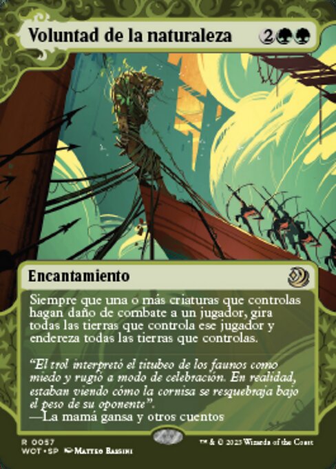 |  Variations— Parts— | Voluntad de la naturalezaSiempre que una o más criaturas que tú controles hagan daño de combate a un jugador, gira todas las tierras que controle ese jugador y endereza todas las tierras que tú controles.