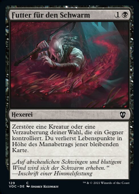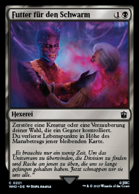 ![]() Variations— Parts— | Futter für den SchwarmZerstöre eine Kreatur oder eine Verzauberung deiner Wahl, die ein Gegner kontrolliert. Du verlierst Lebenspunkte in Höhe des Manabetrags jener bleibenden Karte.