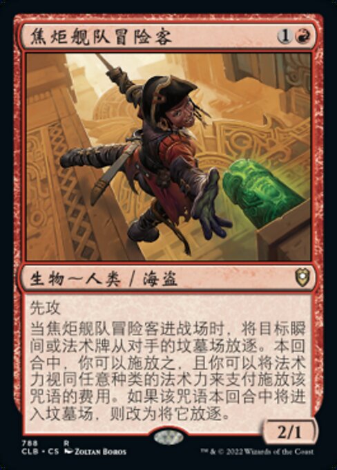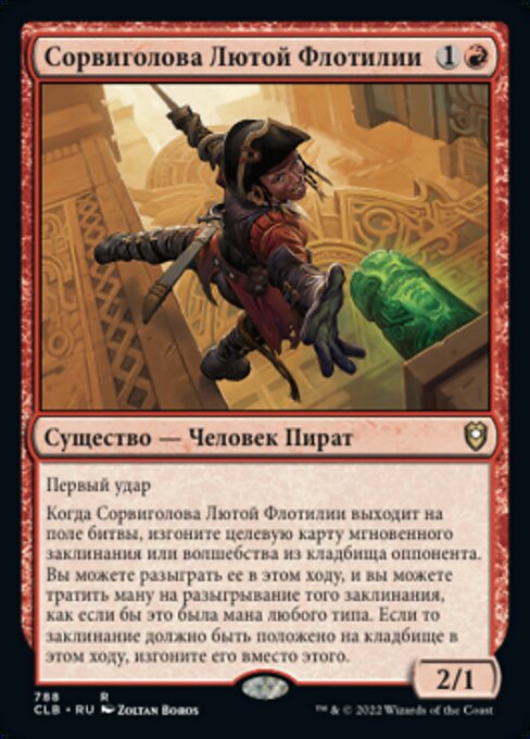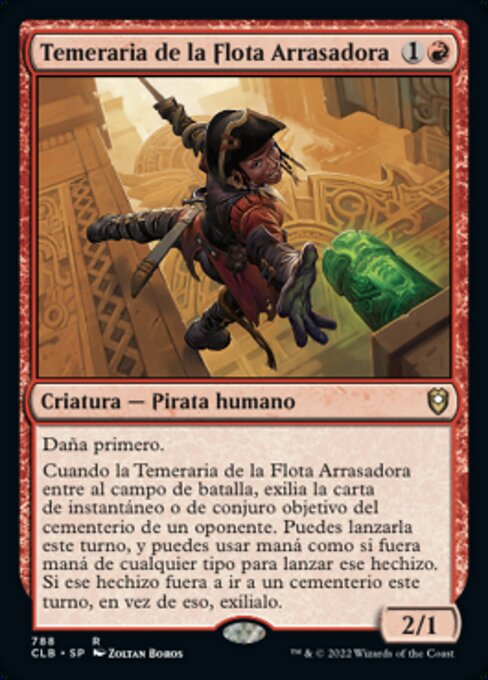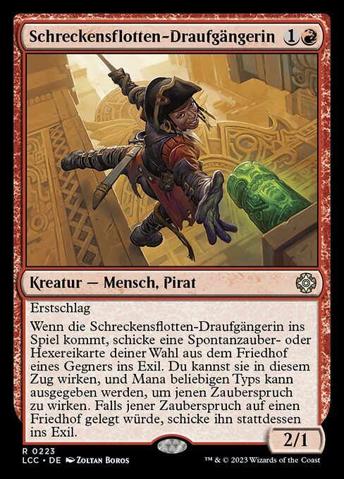 |  Variations— Parts— | Schreckensflotten-Draufgängerin2 / 1 Erstschlag Wenn die Schreckensflotten-Draufgängerin ins Spiel kommt, schicke eine Spontanzauber- oder Hexereikarte deiner Wahl aus dem Friedhof eines Gegners ins Exil. Du kannst die Karte in diesem Zug wirken, und um sie zu wirken, kannst du Mana ausgeben, als wäre es Mana eines beliebigen Typs. Falls der Zauberspruch in diesem Zug auf einen Friedhof gelegt würde, schicke ihn stattdessen ins Exil.