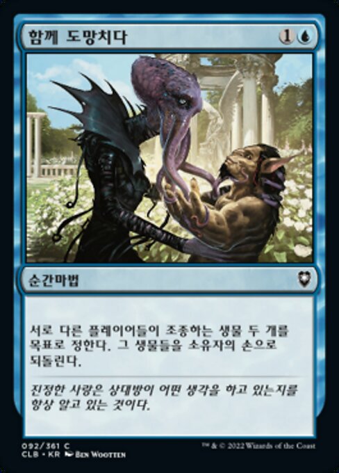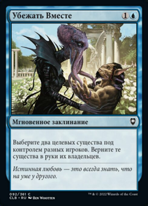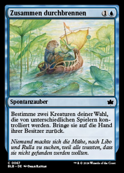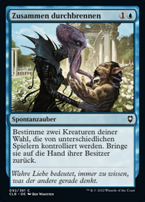 |  Variations— Parts— | Zusammen durchbrennenBestimme zwei Kreaturen deiner Wahl, die von unterschiedlichen Spielern kontrolliert werden. Bringe sie auf die Hand ihrer Besitzer zurück.