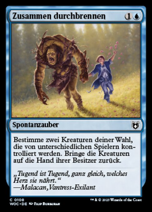 ![]() Variations— Parts— | Zusammen durchbrennenBestimme zwei Kreaturen deiner Wahl, die von unterschiedlichen Spielern kontrolliert werden. Bringe sie auf die Hand ihrer Besitzer zurück.