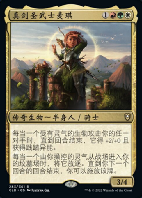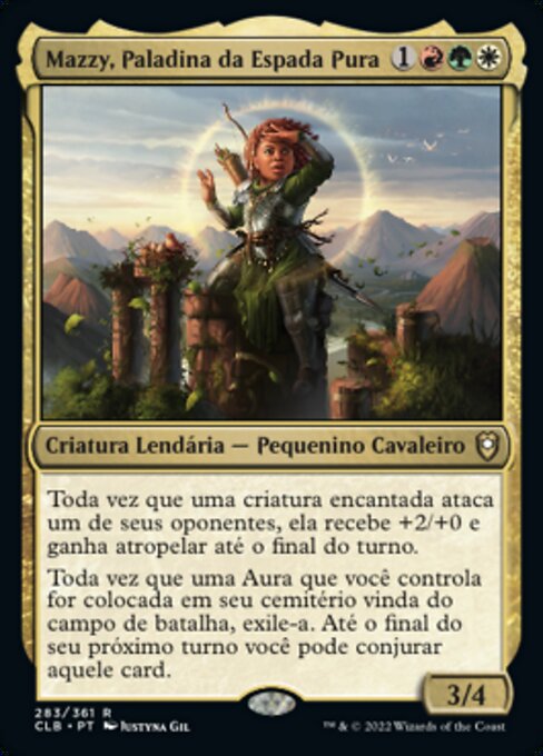 ![]() Variations : 2Parts— | Mazzy, Truesword Paladin3 / 4 Whenever an enchanted creature attacks one of your opponents, it gets +2/+0 and gains trample until end of turn. Whenever an Aura you control is put into your graveyard from the battlefield, exile it. Until the end of your next turn, you may cast that card.