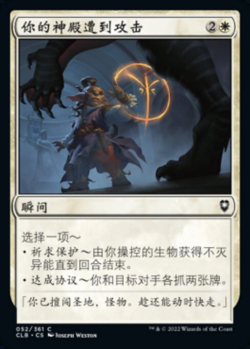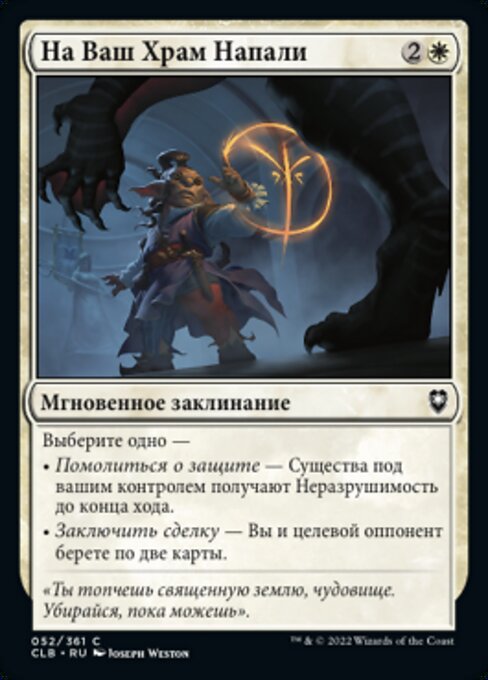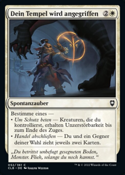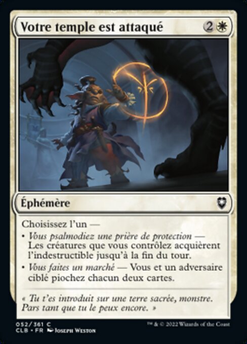 |  Variations— Parts— | Your Temple Is Under AttackChoose one — • Pray for Protection — Creatures you control gain indestructible until end of turn. • Strike a Deal — You and target opponent each draw two cards.