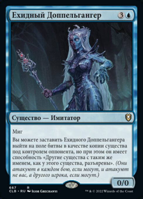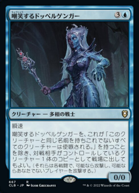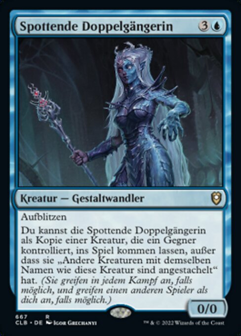 |  Variations : 1Parts— | Mocking Doppelganger0 / 0 Flash You may have this creature enter as a copy of a creature an opponent controls, except it has "Other creatures with the same name as this creature are goaded." (They attack each combat if able and attack a player other than you if able.)
