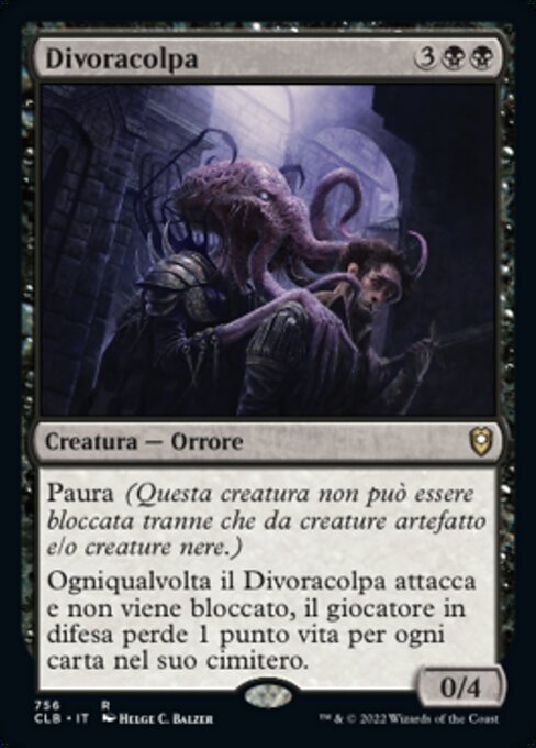 |  Variations— Parts— | Guiltfeeder0 / 4 Fear (This creature can't be blocked except by artifact creatures and/or black creatures.) Whenever this creature attacks and isn't blocked, defending player loses 1 life for each card in their graveyard.
