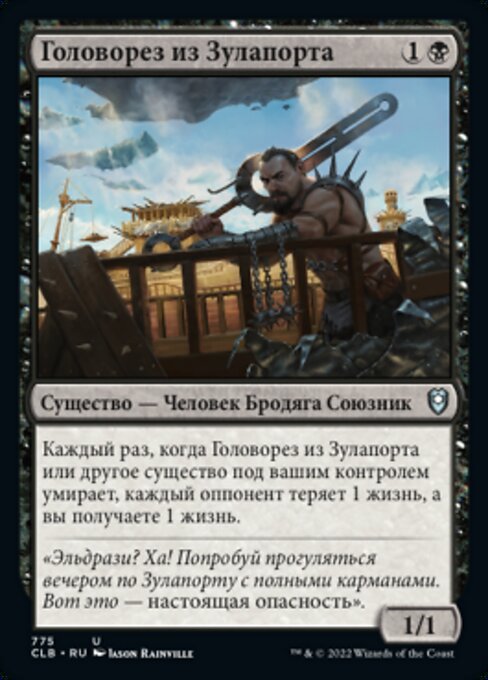 |  Variations— Parts— | Degollador de Zulaport1 / 1 Siempre que el Degollador de Zulaport u otra criatura que controlas muera, cada oponente pierde 1 vida y tú ganas 1 vida.