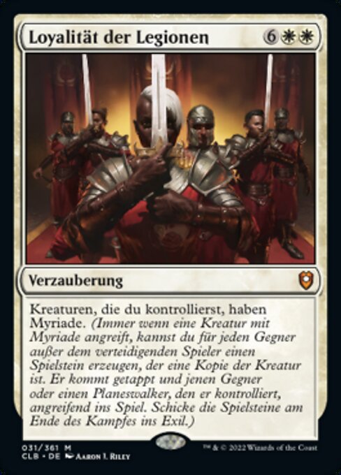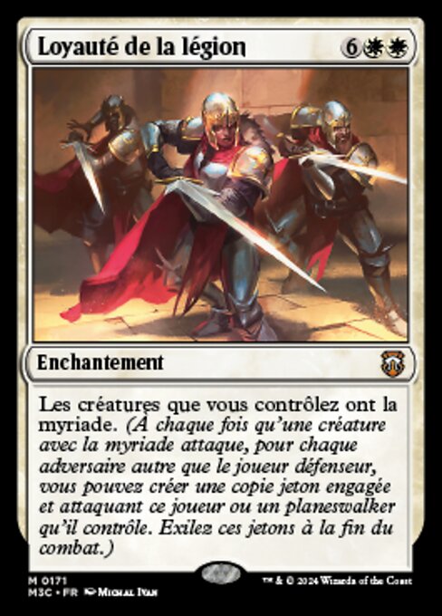 ![]() Variations : 1Parts— | Loyauté de la légionLes créatures que vous contrôlez ont la myriade. (À chaque fois qu'une créature avec la myriade attaque, pour chaque adversaire autre que le joueur défenseur, vous pouvez créer un jeton qui est une copie de cette créature, engagé et attaquant ce joueur ou un planeswalker qu'il contrôle. Exilez ces jetons à la fin du combat.)