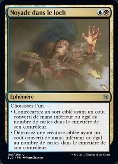 ![]() Variations— Parts— | Noyade dans le lochChoisissez l'un — • Contrecarrez un sort ciblé avec une valeur de mana inférieure ou égale au nombre de cartes dans le cimetière de son contrôleur. • Détruisez une créature ciblée avec une valeur de mana inférieure ou égale au nombre de cartes dans le cimetière de son contrôleur.