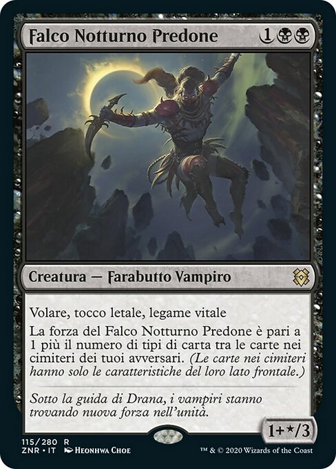 ![]() Variations— Parts— | Falco Notturno Predone1+* / 3 Volare, tocco letale, legame vitale La forza del Falco Notturno Predone è pari a 1 più il numero di tipi di carta tra le carte nei cimiteri dei tuoi avversari.