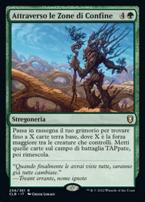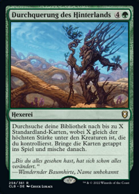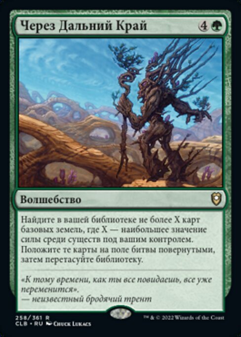 ![]() Variations : 1Parts— | 辺境地横断あなたのライブラリーから基本土地・カード最大X枚を探し、タップ状態で戦場に出す。その後、ライブラリーを切り直す。Xはあなたがコントロールしているクリーチャーの中で最大のパワーに等しい。