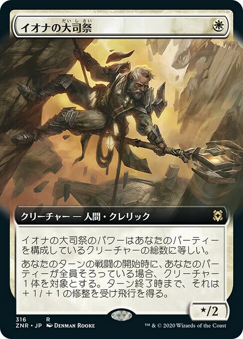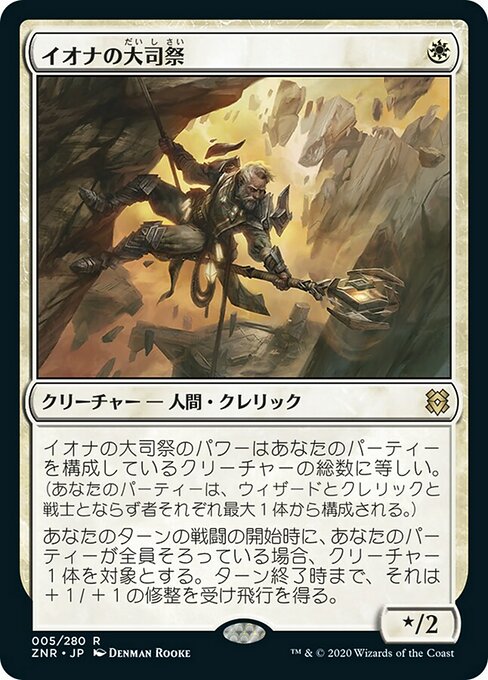 ![]() Variations— Parts— | イオナの大司祭* / 2 イオナの大司祭のパワーはあなたのパーティーを構成しているクリーチャーの数に等しい。(あなたのパーティーは、ウィザードとクレリックと戦士とならず者それぞれ最大1体から構成される。) あなたのターンの戦闘の開始時に、あなたのパーティーが全員そろっている場合、クリーチャー1体を対象とする。ターン終了時まで、それは+1/+1の修整を受け飛行を得る。