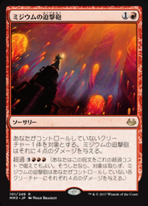 ![]() Variations— Parts— | ミジウムの迫撃砲あなたがコントロールしていないクリーチャー1体を対象とする。ミジウムの迫撃砲はそれに4点のダメージを与える。 超過