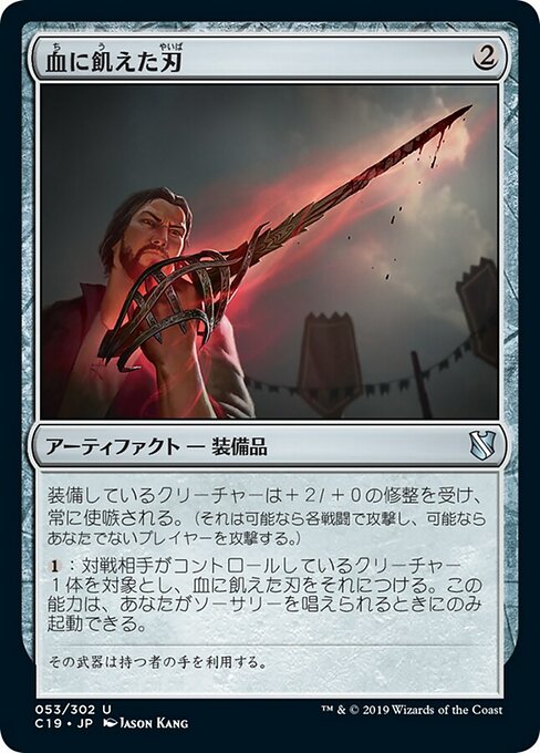 ![]() Variations— Parts— | 血に飢えた刃装備しているクリーチャーは+2/+0の修整を受け、使嗾されている。(それは各戦闘で可能なら攻撃し、可能ならあなたでないプレイヤーを攻撃する。)