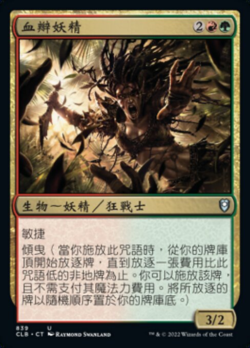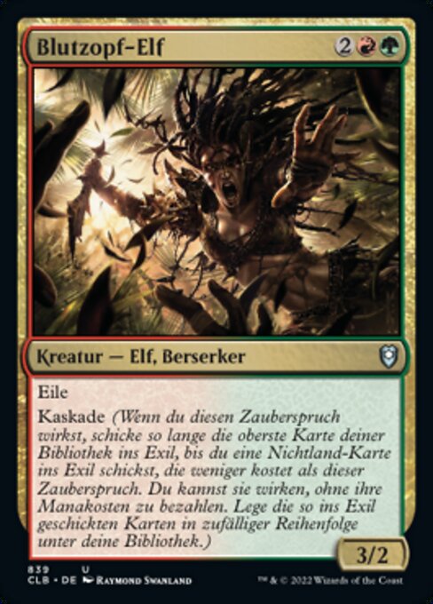 |  Variations— Parts— | Elfa Tranças-de-sangue3 / 2 Ímpeto Cascata (Quando conjurar esta mágica, exile cards do topo de seu grimório até exilar um não de terreno com custo inferior. Você pode conjurá-lo sem pagar seu custo de mana. Coloque os cards exilados no fundo de seu grimório em ordem aleatória.)