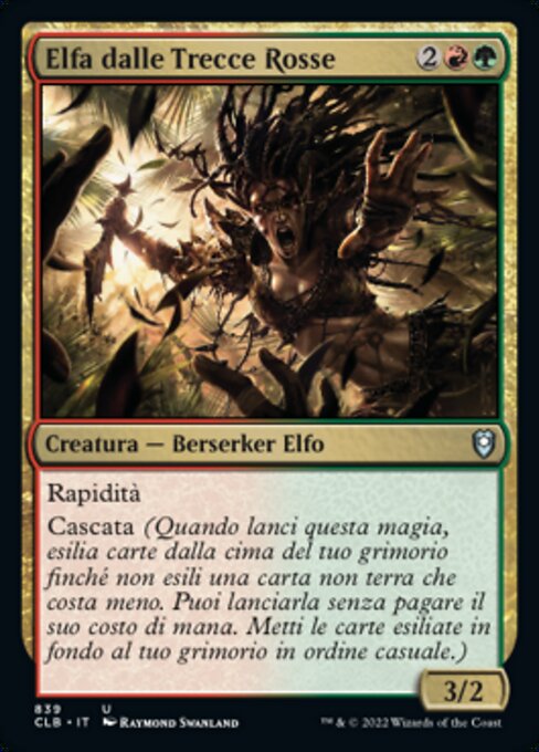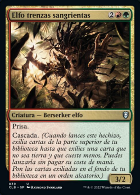 ![]() Variations— Parts— | Elfa Tranças-de-sangue3 / 2 Ímpeto Cascata (Quando conjurar esta mágica, exile cards do topo de seu grimório até exilar um não de terreno com custo inferior. Você pode conjurá-lo sem pagar seu custo de mana. Coloque os cards exilados no fundo de seu grimório em ordem aleatória.)